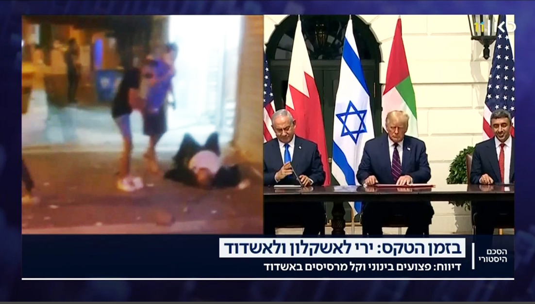 Lederne var samlet utenfor Det hvite hus i Washington for å signere den såkalte «Abraham-avtalen» mellom USA, Israel, Emiratene og Bahrain. Den israelske kringkastingen Kan viste bilder fra taler og seremonier. Så brøt de inn i sendingene med bilder fra rakettangrepet mot Ashdod. Der kunne man følge begge begivenheter, freden i Washington og krigen mot Israel.