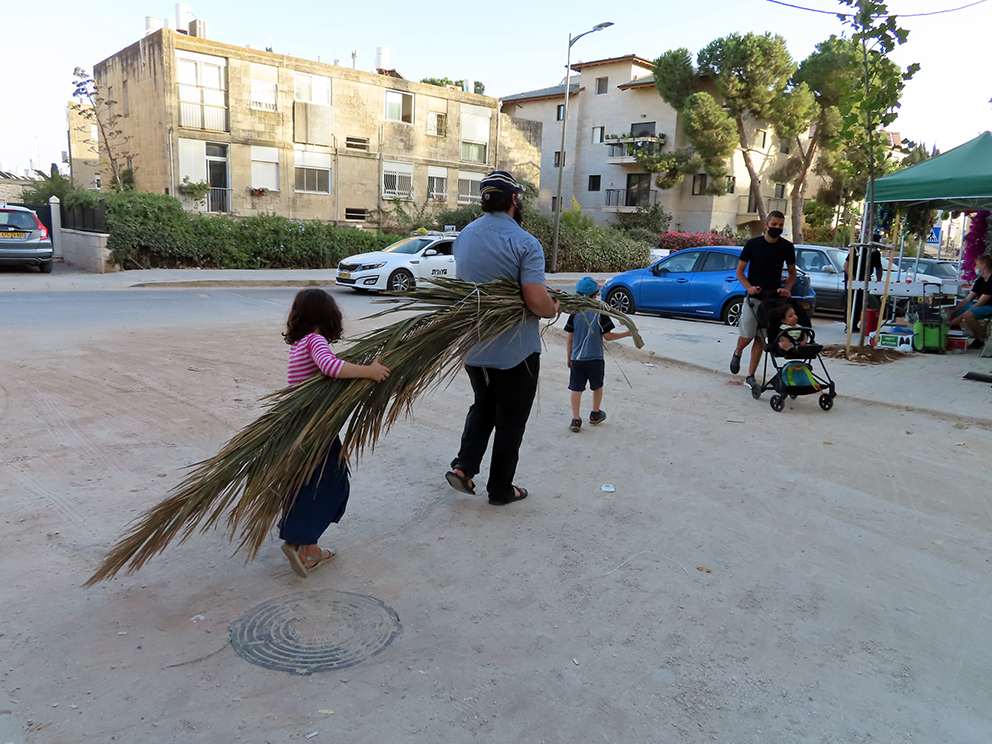 Ved supermarkedet var det noen som surret store palmegrener fast på biltaket. En religiøs familie med flere barn var også der for å finne seg noen fine palmegrener til løvhyttens tak. Far ventet tålmodig, så fikk både sønn og datter være med å bære dem gjennom gatene. De bodde sikkert ikke langt unna. Det var andakt over oppgaven.