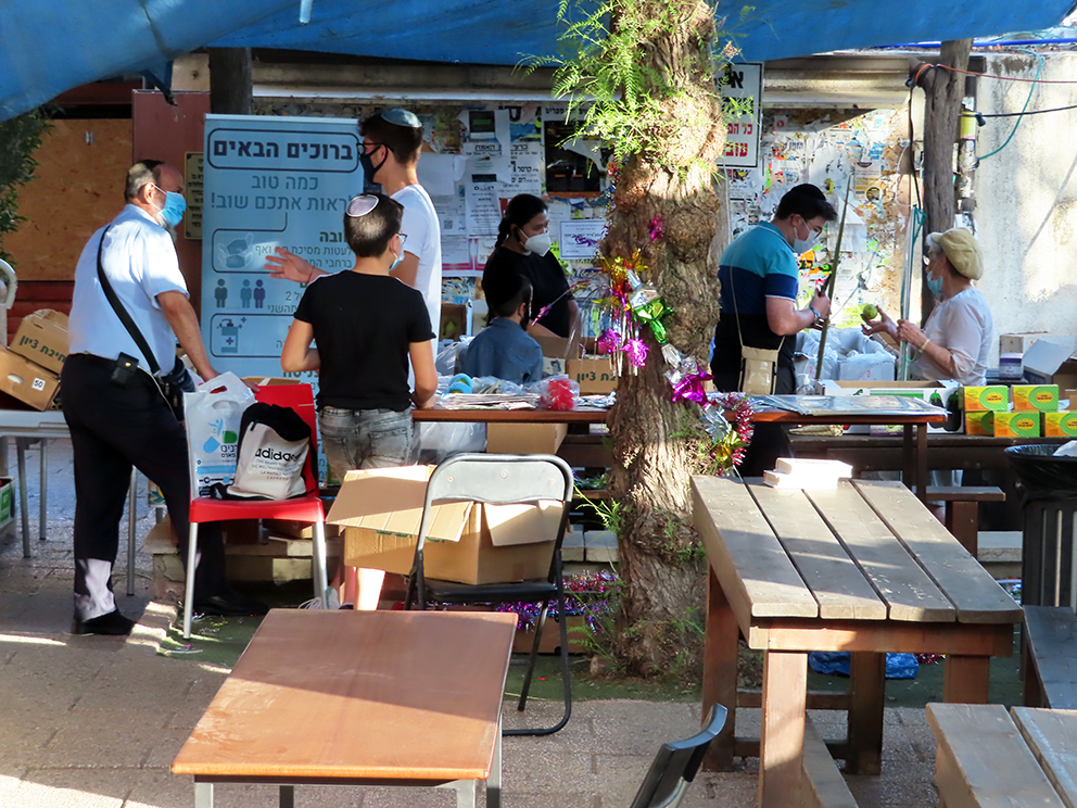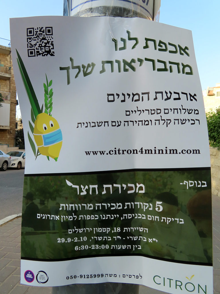 i24NEWS hadde reportasje fra lulav-markedet i Mahane Yehuda i Jerusalem. Dette er trolig et av verdens største marked for omsetning av palmegrener, kvister, etrog og julepynt. Folk står vanligvis tett. Man kan nesten ikke røre seg med raske bevegelser. Men fjernsynet viste at i år var det nesten tomt. Ikke selgere. Ikke folk. Det var kanskje frykten for en bot på 500 eller 1000 shekel som holdt folk borte, i tillegg til frykten for korona og covid-19.