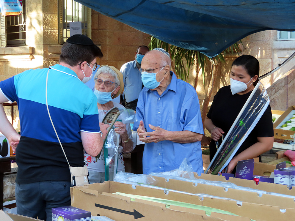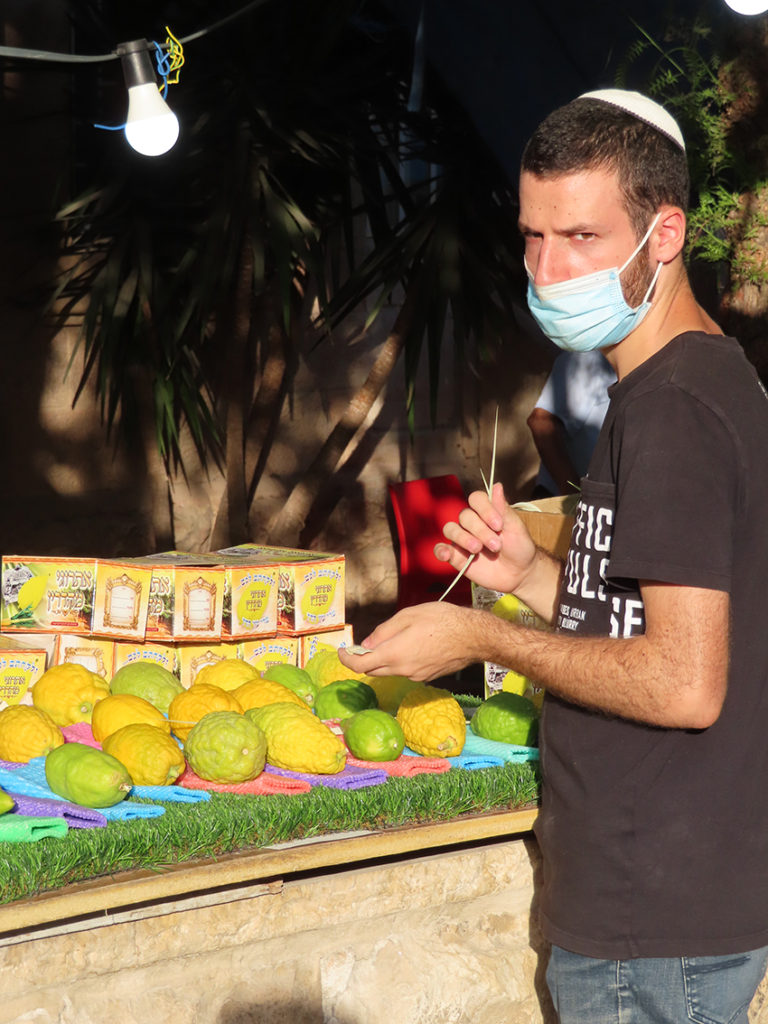 Men slik er det ikke i år. Torsdag ettermiddag var det tre–fire selgere i HaKish-gaten. Et eldre ektepar studerte kvistene. En ung mann handlet, og det var ganske tomt for mennesker. Det skyldes portforbudet. Man får bare gå en kilometer fra sitt hjem, eller til matbutikk og apotek for å kjøpe livsnødvendige saker. Man kan bestille en lulavbukett rett til hjemmet og slipper dermed å gå på markedet. 3. Mosebok 23, 39–43 pålegger jødene å skaffe seg en slik bukett.