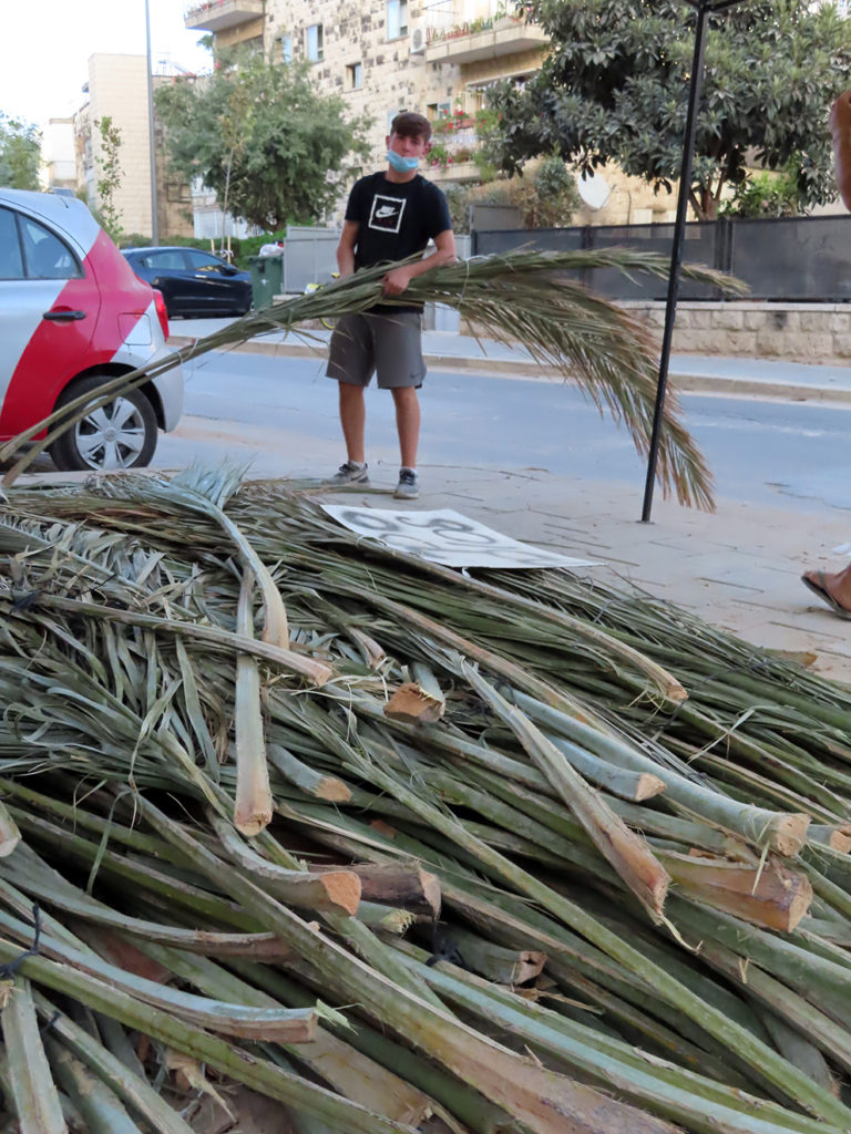Like bortenfor var det lagt ut en stor haug med kuttede palmegrener. I Norden står juletreselgerne med sine gran- og furutrær. I Israel er det palmegreneselgere. For palmegrener er populært når man skal legge tak på løvhytten. Taket skal være slik at det dekker hytten, men man skal kunne se stjernene gjennom grenene. Det skal minne om at om Gud ikke vokter løvhytten som under ørkenvandringen, så vokter vekteren forgjeves. Vann og vind kan trenge inne.