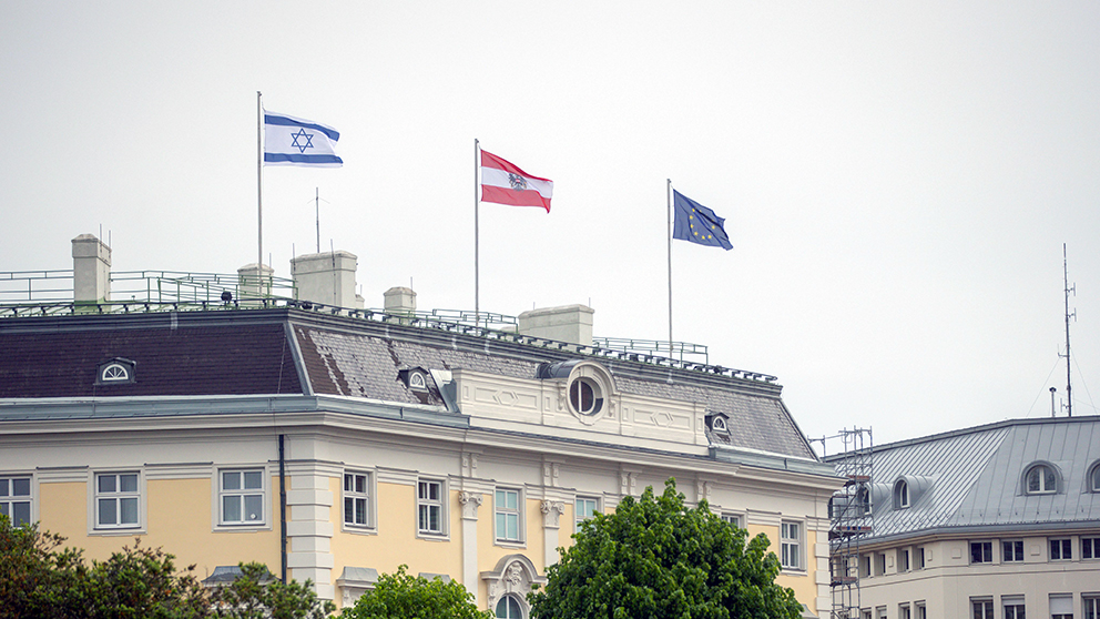Det israelse flagget vaiet i vinden sammen med Østerrikets flagg i midten og EU-flagget.