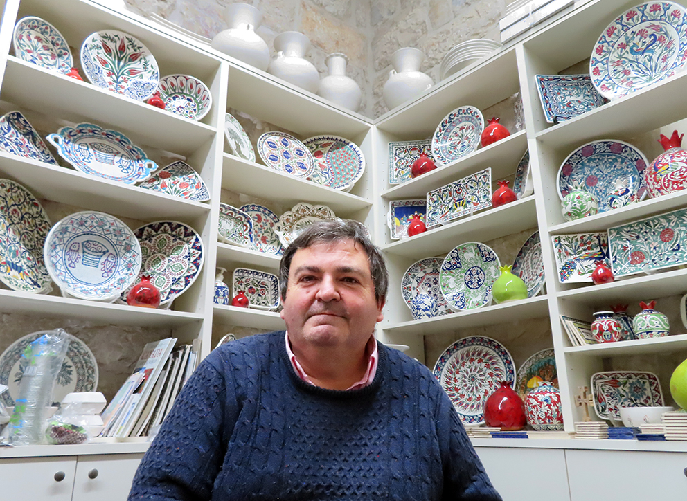 (Jerusalem, 16.12.2021): Når turistene uteblir, forsøker butikkene i Det kristne kvarter i Jerusalem å lokke til seg israelere. En av dem er den israelske armeneren George Sandrouni som driver Armensk keramikksenter.