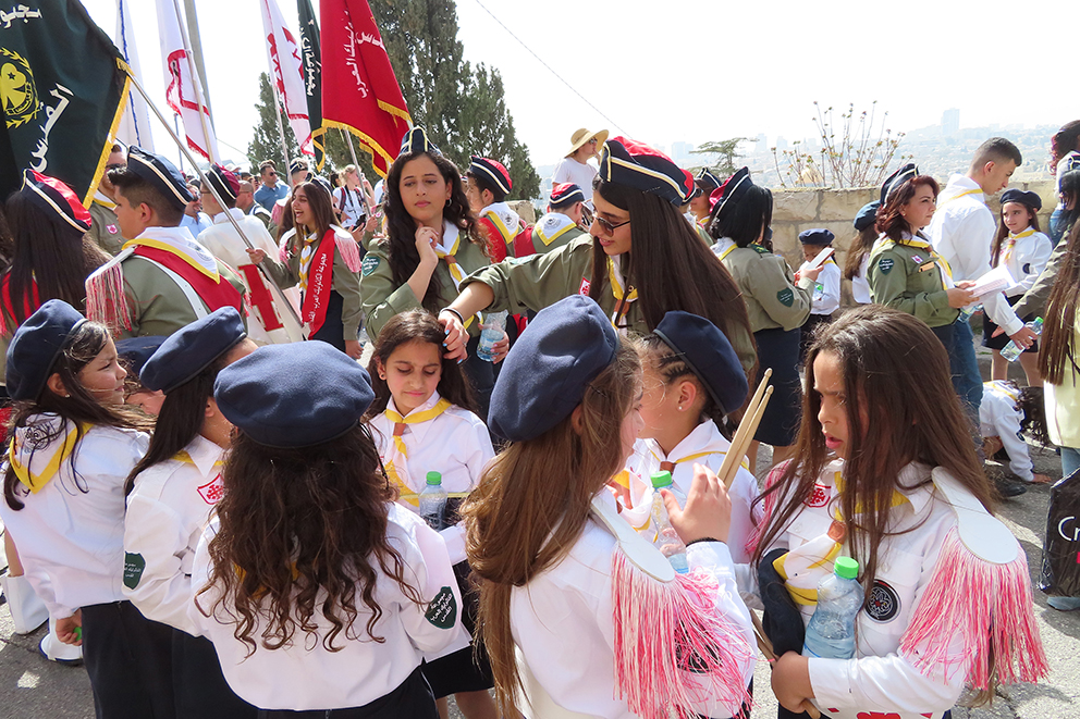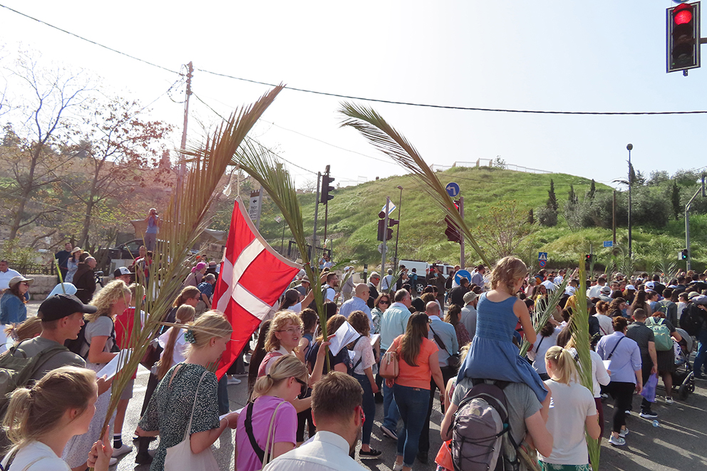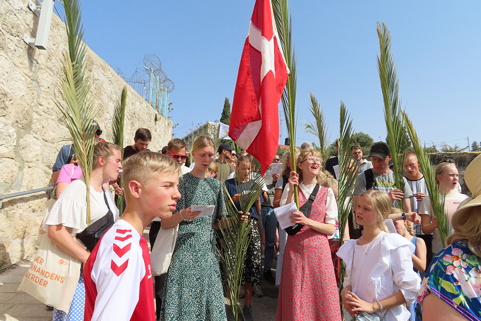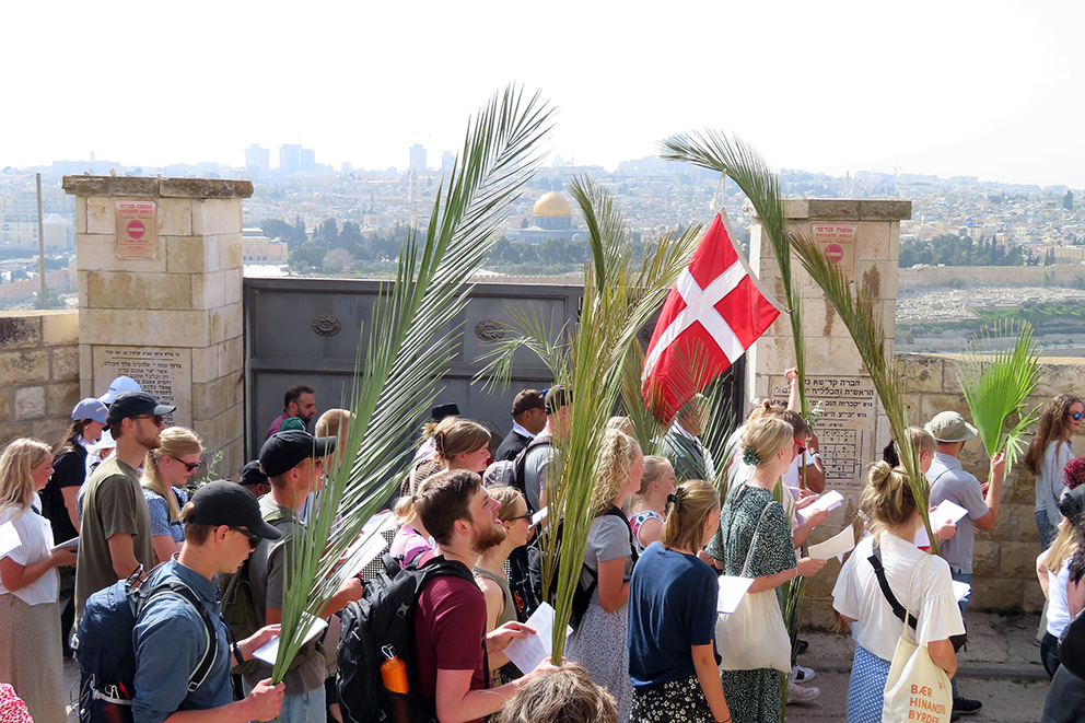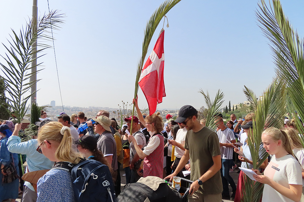 Fra Oljeberget så deltakerne i prosesjonen rett mot Tempelplassen med Klippedomen og den berømte gullkuppelen. Svært mange mennesker hadde palmegrener eller en olivenkvist i hånden. Danskene hadde et flagg. Dannebrog var festet til en palmegren. Av og til strakte Dannebrog seg helt ut når grenen beveget seg eller et vindpust tok tak. Foran så man Det hvite korset på rød bunn og lenger bak den muslimske gullkuppelen.