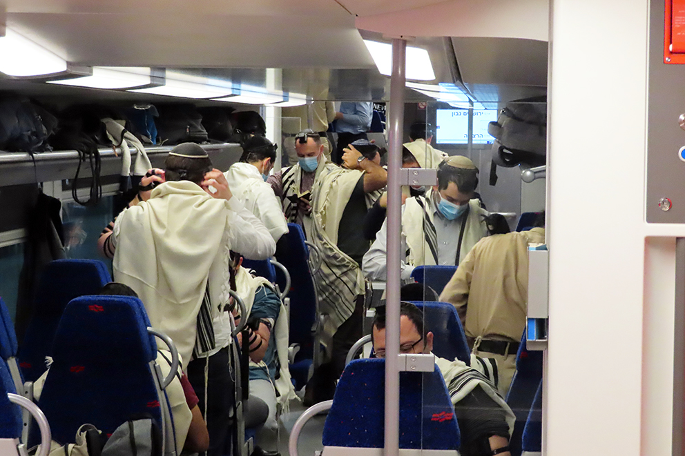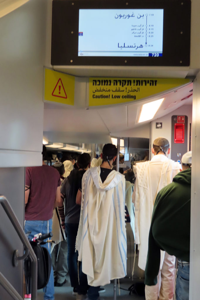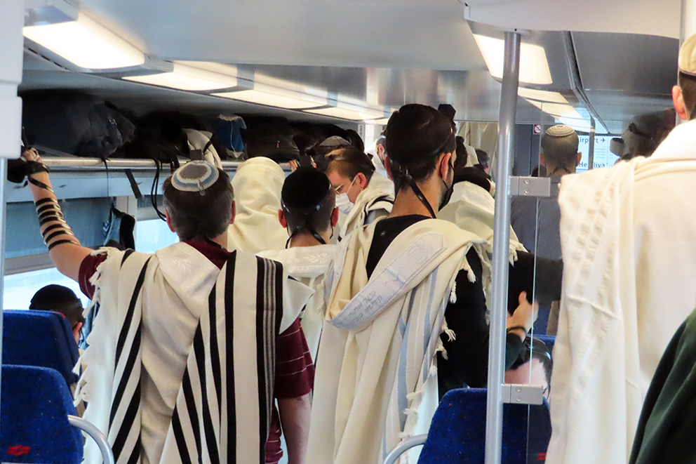 Det er ganske fullt i togvognen, nesten som i en synagoge på Israels helligste dag yom kippur. Folk pakker ut sine «bønneremmer» i sort lær. De tuller dem rundt armen, rundt langfingeren og på hånden. Slik oppfyller religiøse jødiske menn Moseloven fra 5. Mosebok 6, 8: «Du skal binde dem som et tegn på din hånd, de skal være en minneseddel på din panne.»