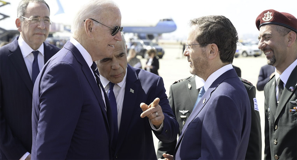 (Jerusalem 15.07.2022): Staben til USAs president Joe Biden fjernet det israelske flagget på limousinene før de kjørte opp til det palestina-arabiske hospitalet Augusta Victoria på Oljeberget i staten Israel. Da bilene kjørte til Betlehem, satte amerikanerne på et PLO-flagg sammen med det amerikanske flagget. I Betlehem gjorde Biden det klart at han er for en tostatsløsning etter grensene fra 1967. Han sa at Jerusalem må være en by for alle sine folk.
