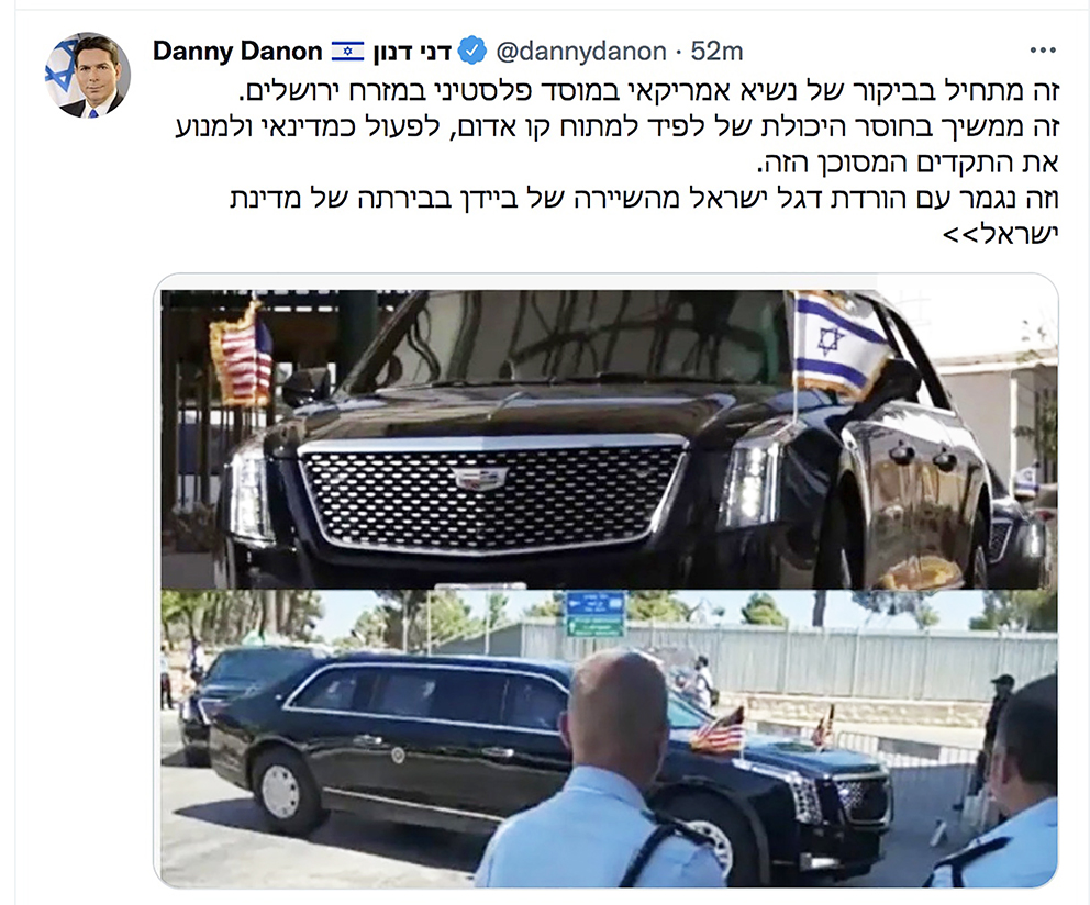 –Det startet med at USAs president besøkte den palestina-arabiske institusjonen (Augusta Victoria hospital) i den østlige delen av Jerusalem. Det fortsatte med at Israels statsminister Yair Lapid ikke var i stand til å sette en rød linje for denne farlige presedens. Og det endte med at det israelske flagget ble fjernet fra Bidens følge i hovedstaden til staten Israel. Statsminister Lapid får karakteren «ikke bestått» for dette besøket. Det er skremmende å tenke på hvordan fremtidige besøk av diplomater vil bli i de kommende måneder. Vi må erstatte denne forferdelige regjeringen, sa Danny Danon ifølge Arutz 7.