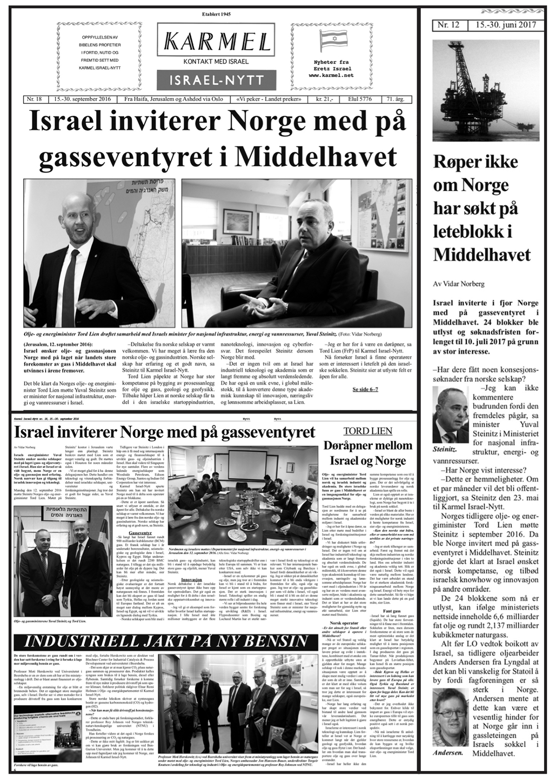 Den 12. september 2016 var Israel i startgropa på sitt oljeeventyr. Israelerne ønsket fremfor alt norsk kompetanse. Israels olje- og energiminister Yuval Steinitz hilste Norges olje- og energiminister Tord Lien (FrP) med sin norske delegasjon velkommen til sitt kontor i olje- og energidepartementet i Jerusalem for å fremlegge planene.
