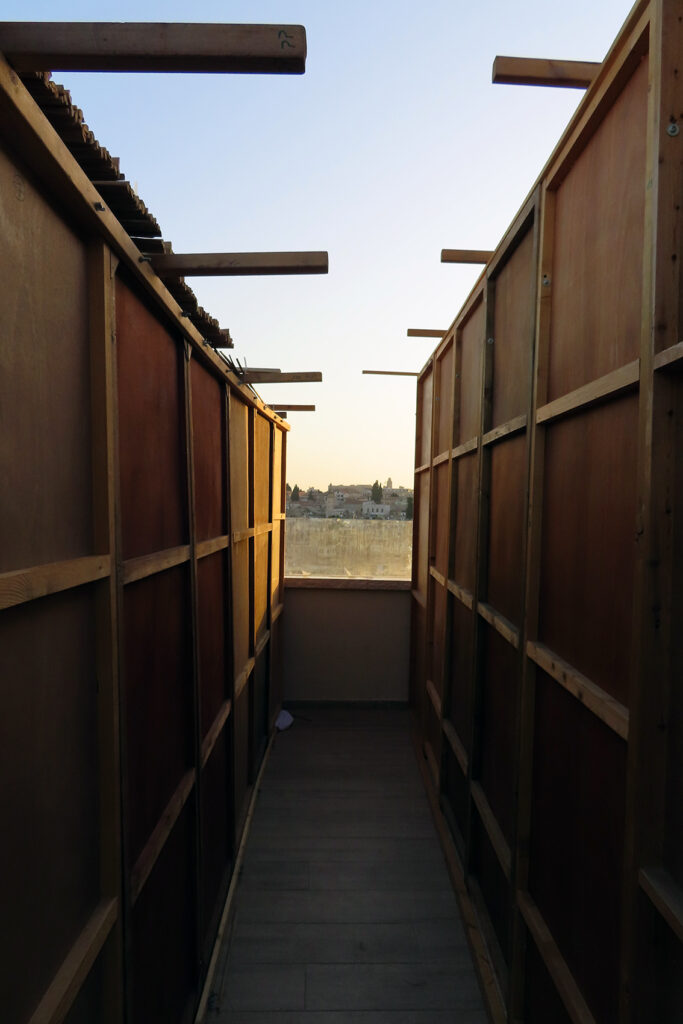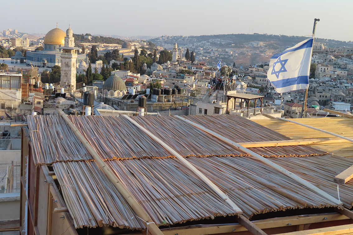 Israelerne bygger løvhytter til løvhyttefesten i Jerusalem. KARMEL var sammen med predikant og Israel-venn Roald Evensen og kona Gunn-Berit på bytur i Jerusalem og så noen nesten ferdige hytter som er plassert på taket.