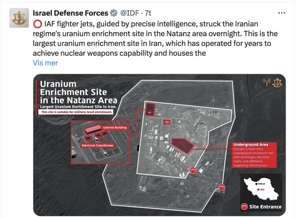 Fredag kveld ble det meldt at Israel angriper Fordow som er Irans befestede kjernefysiske anlegg. Forsvaret fortsatte utover fredagen å kalle opp reserver til Israels forsvar.