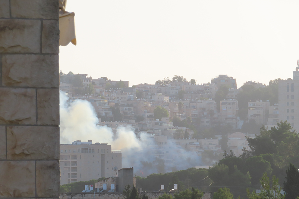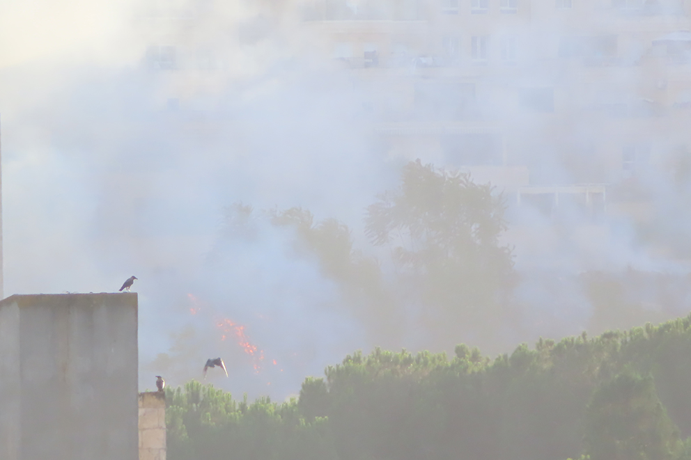 Når temperaturen stiger over 30 varmegrader, blir det lett skogbrann. Det kan skje innenfor hovedstaden Jerusalems bygrenser. Disse bildene er fra den vestlige delen av Jerusalem. Israel satte inn brannslukningsfly som raskt fikk kontroll over ilden. Noen fugler satt på taket og fulgte med.