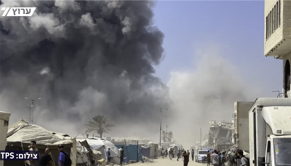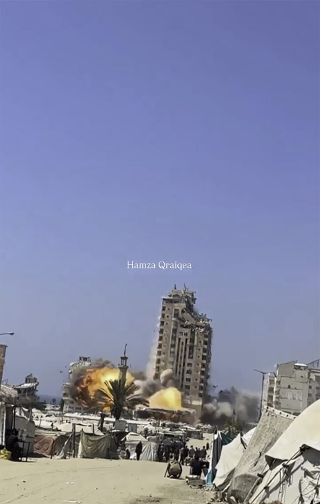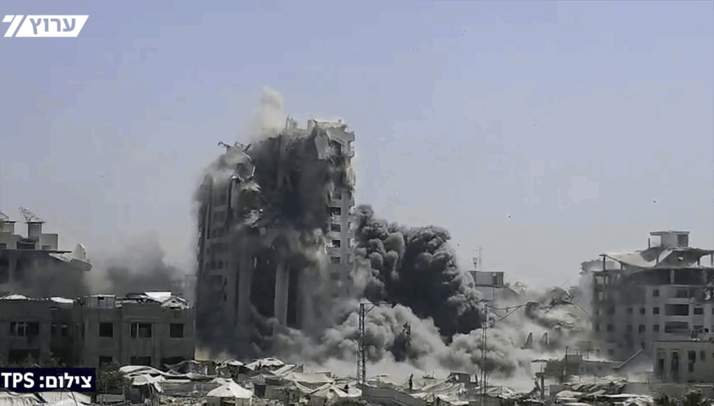 Fredag ettermiddag ble et høybygg i Gaza City rammet av et israelsk flyangrep. Bygget brukes av Hamas til å angripe israelske posisjoner. Israel varslet på forhånd om angrepet slik at folk skulle forlate området.