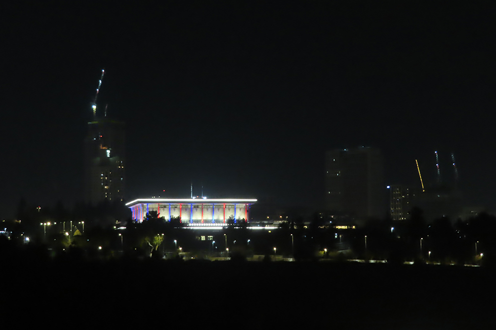 Den israelske nasjonalforsamnlinen Knesset i Jerusalem ble søndag kveld opplyst i de australske farger etter at minst 15 mennesker ble skutt ned og drept og 42 ble skadet i Sidney i Australia under et muslimsk terrorangrep da den jødiske hanukka-festen startet 14. desember 2025. (Foto: Vidar Norberg)