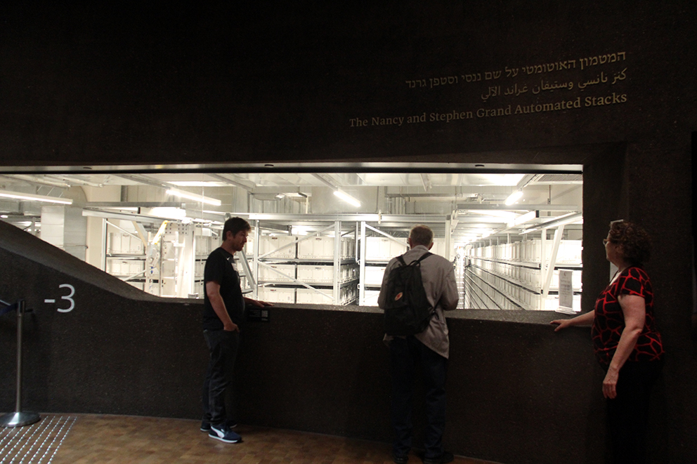 I Israels Nasjonalbibliotek er det mange rom. Noen rom er uten vindu og sollys som er farlig for gammelt papir med trykk. Her sitter lederen for tidsskrifter og aviser. Innbundne aviser er stablet opp i hauger.