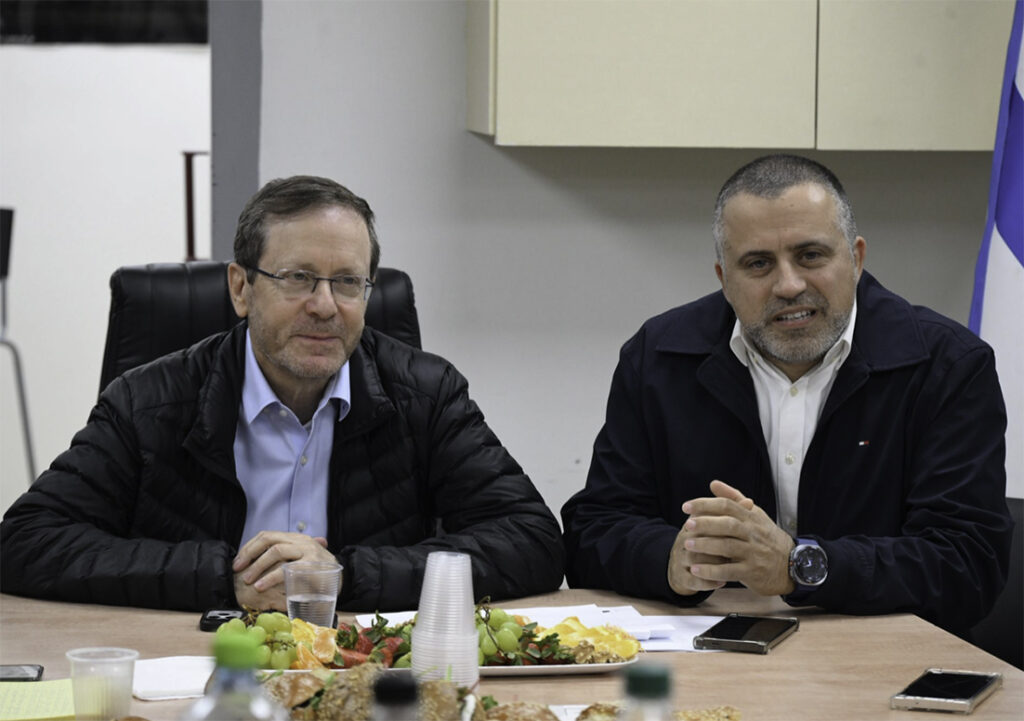 Israels president Isaac Herzog og ordfører Avichai Stern i Kiryat Shmona. (Foto: Haim Zach, GPO).