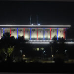 Den israelske nasjonalforsamnlinen Knesset i Jerusalem ble søndag kveld opplyst i de australske farger etter at minst 15 mennesker ble skutt ned og drept og 42 ble skadet i Sidney i Australia under et muslimsk terrorangrep da den jødiske hanukka-festen startet 14. desember 2025. (Foto: Vidar Norberg) … (Les mer...)